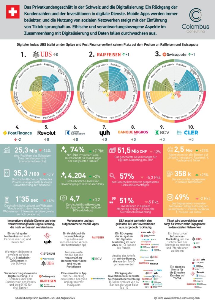 Die UBS bleibt dank einer starken digitalen Strategie, die hervorragendes Marketing und gute Sichtbarkeit in den sozialen Netzwerken kombiniert, an der Spitze. Raiffeisen macht Fortschritte und setzt sich im Bereich Web durch, während PostFinance aufgrund uneinheitlicherer Leistungen im Bereich soziale Netzwerke und verantwortungsbewusste Digitalisierung zurückfällt. Unter den aufstrebenden Banken bestätigt Swissquote ihre Dynamik dank Innovation und einem starken Engagement für verantwortungsbewusstes Digitalisieren, und Revolut behauptet ihre Position dank der Leistungsfähigkeit ihres mobilen Ökosystems. Das Podium 2025 verdeutlicht die zunehmende Reife von Banken, die Leistung, Innovation und Verantwortung miteinander verbinden.